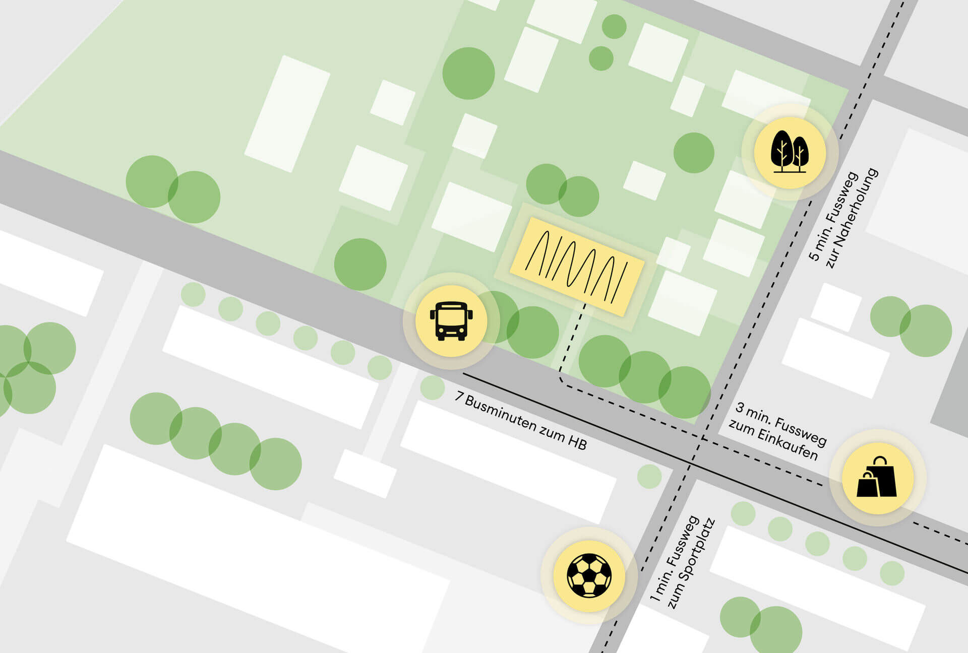 Dein Zuhause mit "eigener" Bushaltestelle. Drei erquickende Geh-Minuten zu Supermarkt, Apotheke und Naherholungsgebiet. Kurze 7 Busminuten zum HB und damit auch ins wuselige Getümmel der Altstadt. Bei uns bist du mittendrin statt nur dabei.